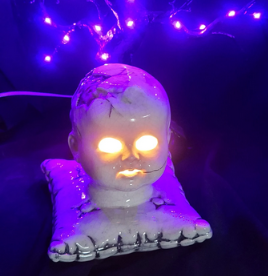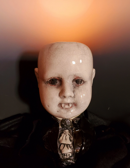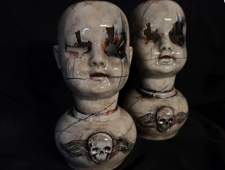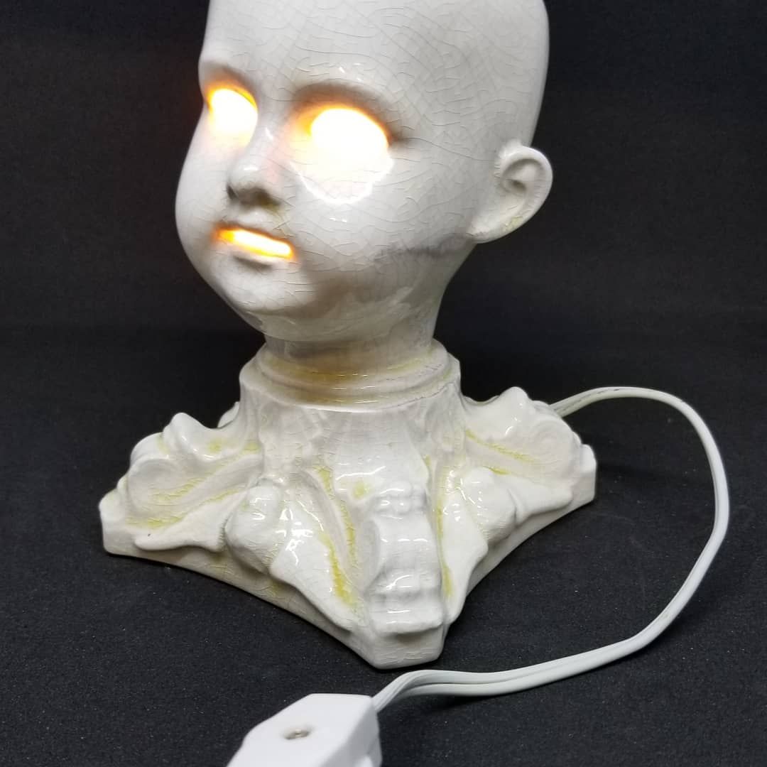 V.Centneo designed the Original Creepy Doll Head Lamp, which became a best seller with over 1,000 units sold. Drawing inspiration from classic black and white horror films, these lamps appeal to doll collectors of all ages, encouraging a lighthearted appreciation for vintage campy cinema. Pop some popcorn and dim the lights, it's MOVIE fright night!